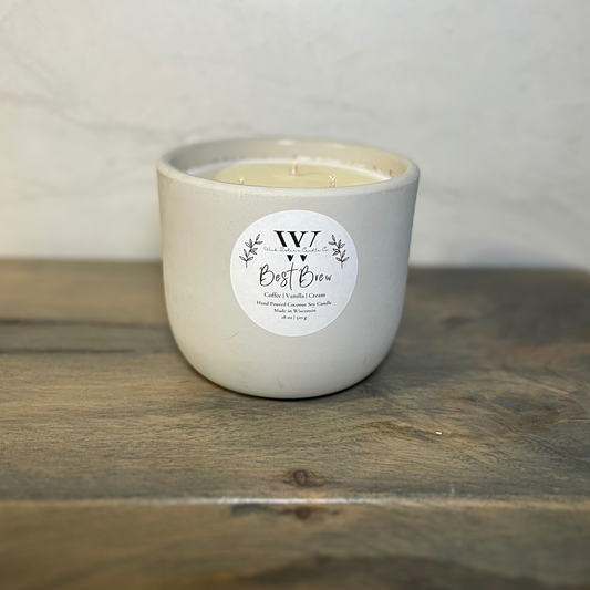 We are a sister duo living in the Northwoods of Wisconsin! This business started with a love of candles and a cute concrete jar. Our handcrafted concrete vessels are unique and reusable. Each vessel is hand made by us and filled with a combination of coconut soy wax and high quality fragrance oils. Each one being one of a kind!